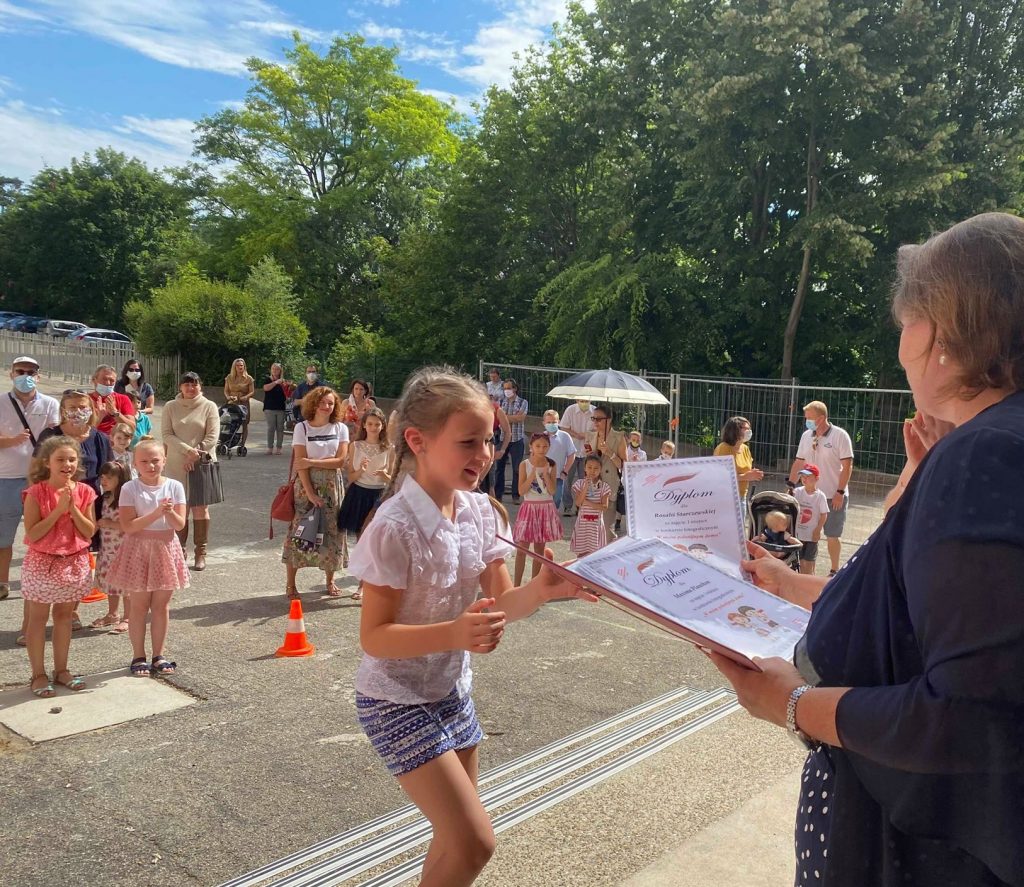 Zapraszamy bardzo serdecznie na krótką fotorelację z zakończenia roku szkolnego w naszej szkole. Odbyło się ono nieco inaczej niż w latach poprzednich na szkolnym podwórku z zachowaniem wszystkich niezbędnych środków ostrożności. Na wstępie Pani Kierownik Elżbieta Blachas podsumowała ten wyjątkowy rok szkolny dziękując wszystkim uczniom, nauczycielom oraz rodzicom za wytrwałość i szczególne zaangażowanie w czasie nauczania zdalnego. Rada Rodziców przekazała również całemu gronu pedagogicznemu serdeczne gratulacje i podziękowania za cały rok wytrwałej pracy. Następnie każdy laureat i uczestnik konkursu „W moim polonijnym domu” otrzymał z rąk Pani Kierownik dyplom oraz nagrodę rzeczową.