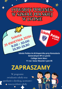 W sobote 25 kwietnia zapraszamy na Otwarty Poranek w Szkole Polskiej im.M.Kopernika przy Konsulacie Generalnym RP w Lyonie w godz. od 9.00 do 10.00 oraz od 12.30 do 13.30! Zapraszamy!